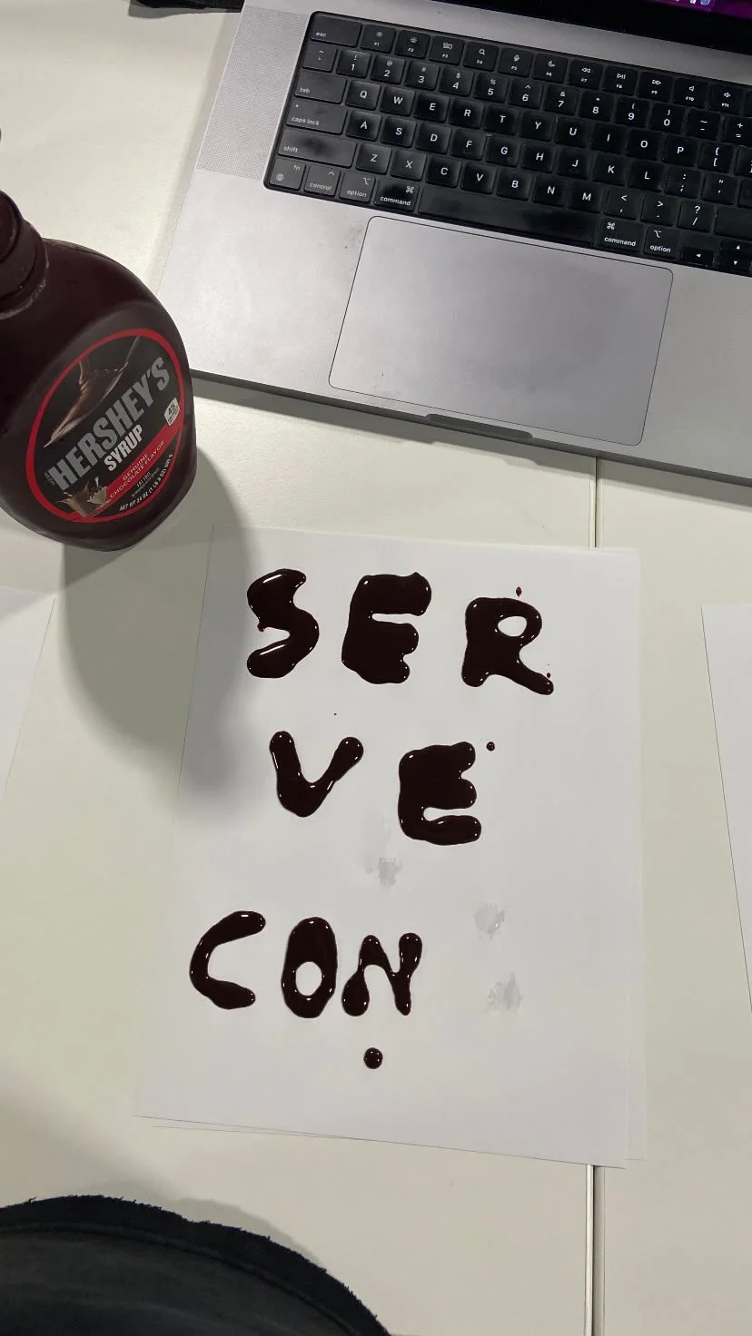 During the drafting of SERVECON25, I had the idea to use practical materials to create a typeface. Pouring syrup onto paper created both depth and bleed in the letters. After bringing them into Photoshop and adjusting the balance, the font was ready to go. Using this method gave the typography a fluid form that meant no letter could be exactly replicated; mirroring each volunteers impact on individuals in the organization.